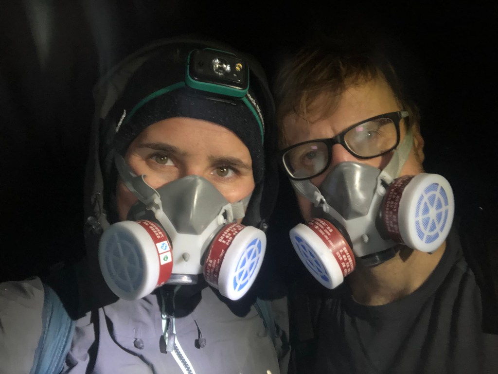 An einer Stelle entstehen in einem chemischen Prozess, von dem wir beide nicht den leisesten Schimmer haben, blaue Flammen, die allerdings nur bei Dunkelheit zu sehen sind. Da die aufsteigenden Schwefeldämpfe gesundheitsschändlich sind, wurden uns Atemmasken mitgegeben. Auf dem Weg hinab nahmen wir erst nur einen leicht schwefligen Geruch war, der sich aber bald intensivierte und als uns die erste „richtige“ Rauchwolke traft, brannte er uns trotz der Masken in Lunge und Augen. Die Flamme war deutlich kleiner, als wir sie erwartet hatten, eigentlich nur ein kleiner blauer Fleck. Trotzdem konnten wir die Faszination nachvollziehen und schauten dem Flackern gerne eine Zeitlang zu, bis uns eine ungünstige Windböe gefühlt minutenlang in den beißenden Rauch einhüllte und wir mit leichter Panik reagierten. Hustend und mit tränenden Augen machten wir uns auf den Aufstieg. Wir waren erleichtert, die gesundheitsschädliche Zone hinter uns zu lassen. Außerdem wartete ja noch der nächste Sonnenaufgang. Auf dem Weg hinauf kam uns eine lange Schlange Absteigender entgegen. Dem Profil der Schuhe/Sandalen/Flip-Flops der Meisten hatten Matsch und Schlamm den Rest gegeben und ihre unglücklichen Besitzer bewegten sich mehr rutschend als gehend den steilen Pfad hinab.