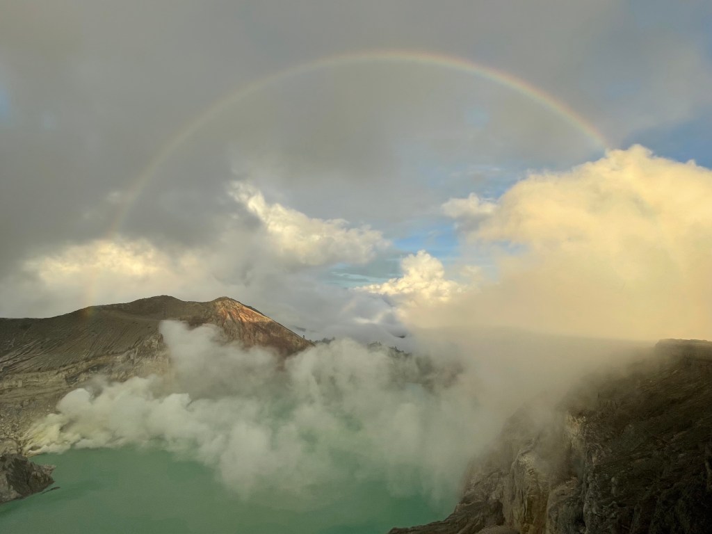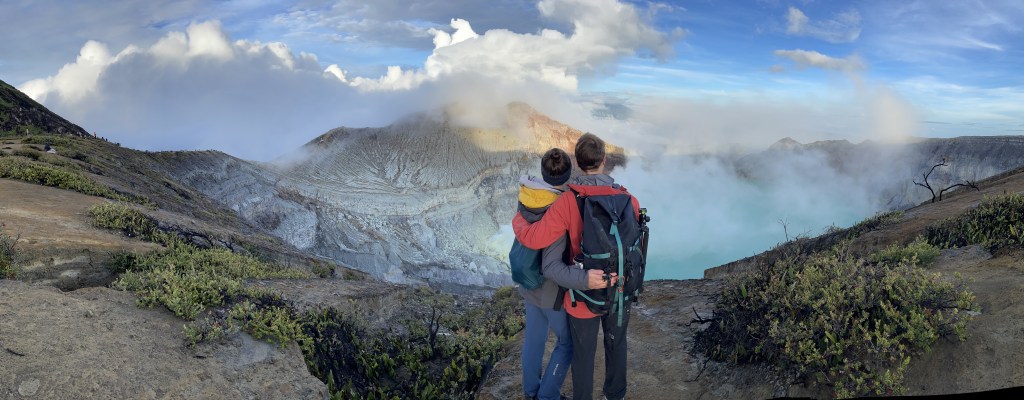 Wir erreichten auf zwei Beinen und vor den meisten anderen den Rand des Kraters und machten uns auf den Abstieg in den Kraterkegel zu der Hauptattraktion: den blauen Flammen. Im Krater selber befindet sich eine Schwefelquelle, in welcher bis heute von Hand Schwefel abgebaut wird. Da es tagsüber zu heiß wird, wird nachts gearbeitet und wir sahen einige der Arbeiter mit einem Tragesystem aus zwei vollgepackten Körben an einer Querstange, wie sie sich den steilen Pfad hinaufmühten.