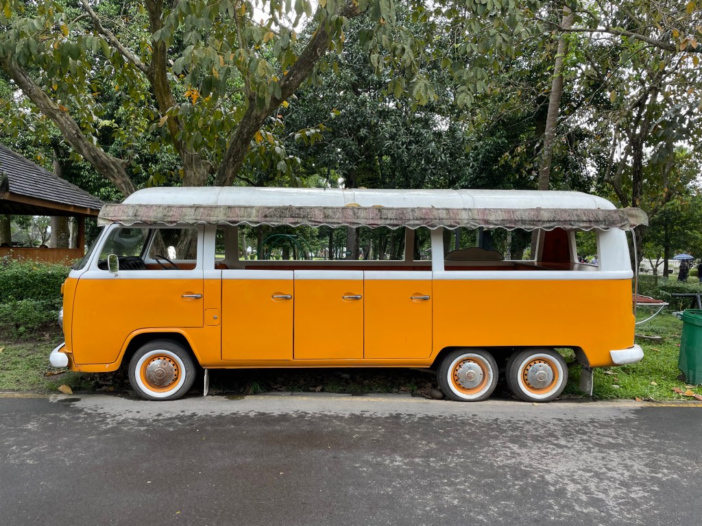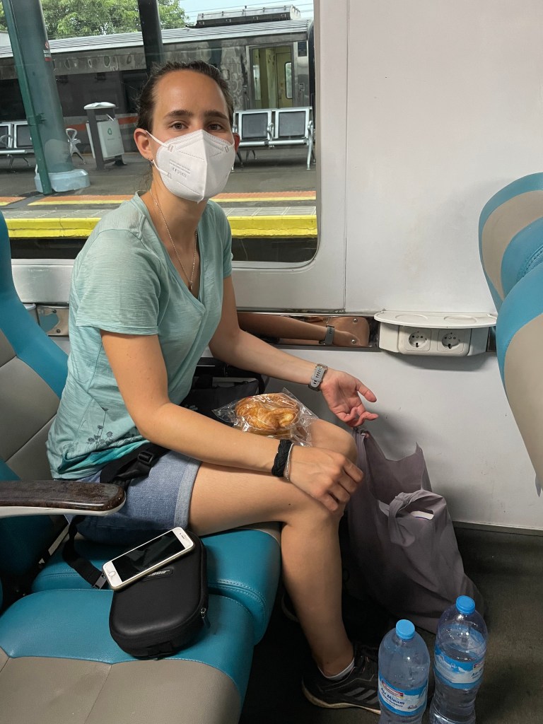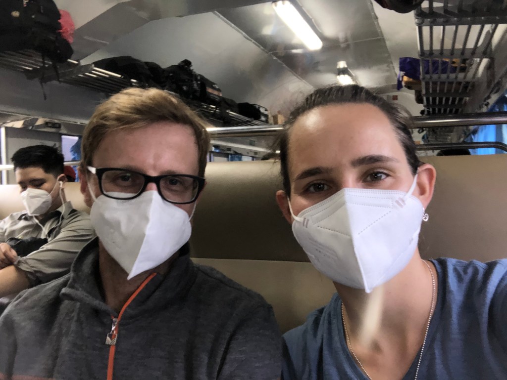 In Jakarta selbst wollten wir keine Zeit verbringen. Wir hatten wenig Positives über die Stadt gelesen und bei unserer Ankunft und Fahrt zum Hostel sahen wir uns in unserer Entscheidung bestätigt. Es war grau und regnerisch, was die feuchte Hitze noch verschlimmerte. Die Straßen waren mit Autos und Rollern verstopft. Positiv auffällig war lediglich, dass am Flughafen erstaunlich viele E-Taxis warteten. Das Hostel lag günstig zur Bahnstation, das war aber auch das einzig Gute. Uns erwartete ein dunkles, eher dreckiges, nach Feuchtigkeit, Muff und altem Zigarettenrauch riechendes Zimmer mit fleckigen Bettlaken und durchgelegener Matratze. Von der anstrengenden Reise erschöpft nahmen wir die Zustände zunächst so hin. Nachdem beim Duschen allerdings plötzlich Wasser von der Decke tropfte, war es für Antonia genug und sie verlangte ein anderes Zimmer. Das „Upgrade“ war etwas besser, Antonia aber dennoch sehr froh, die Stadt und Unterkunft früh am nächsten Morgen verlassen zu können. Schwer bepackt kamen wir am Bahnhof an und waren erst einmal etwas überfordert, wobei es durchaus sehr geregelt zuging. Mit dem QR-Code aus der E-Mail mussten an einem Service-Terminal die Zugtickets ausgedruckt werden. Anschließend ging es mit den Tickets durch die Passkontrolle, wo auch ein Impfnachweis verlangt wurde. Dann konnte man den ausgewiesenen Bahnsteig betreten. Zu unserer Überraschung klappte alles reibungslos und zügig, das Personal war sehr freundlich und hilfsbereit. Der Zug war auf die Minute pünktlich, Wagen- und Platznummer deutlich ausgezeichnet. Die Sitze waren sehr komfortabel mit mehr Beinfreiheit, als wir sie je in einer Bahn erlebt hatten. Der Zug war sauber und ruhig, regelmäßig wurde der Müll eingesammelt und Kaffee/Snacks angeboten. Wir fühlten uns wie die Könige. Nur die Klimaanlage, wie asiatisch-üblich auf Gefrierfach-Temperatur eingestellt, ließ uns schnell lange Hosen und Pullis anziehen. Aber hey, besser als heiß und tropisch.