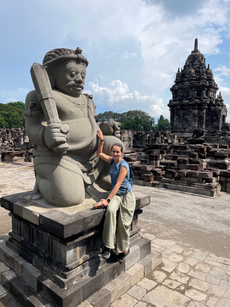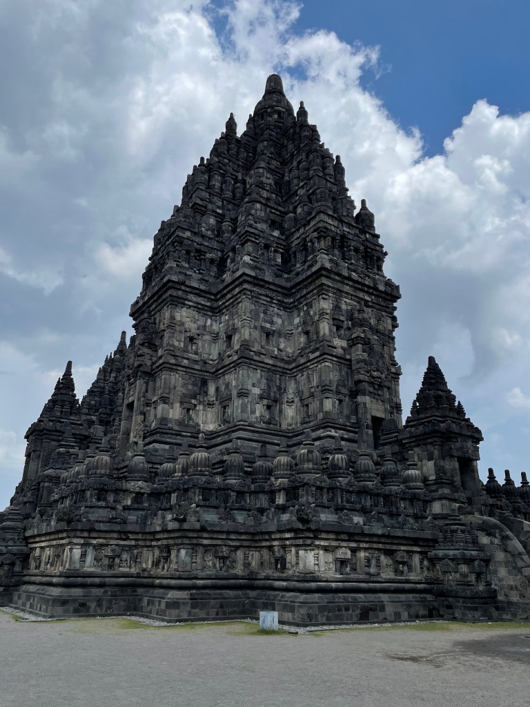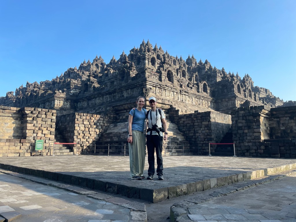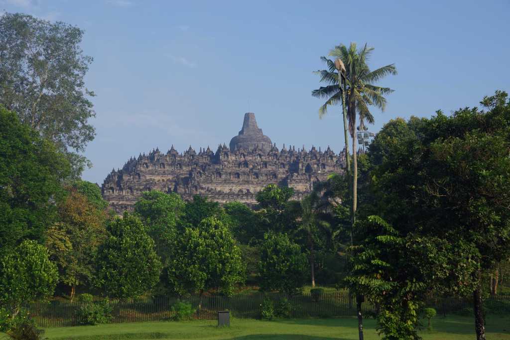 Die Stadt Yogyakarta ist ein beliebtes Ziel vieler Touristen auf Java, da sich in ihrer unmittelbaren Umgebung zwei der wichtigsten Tempelanlagen der Insel befinden, der buddhistische Borobudur und der hinduistische Prambanan. Beide Tempelanlagen zeugen von der wechselhaften Geschichte auf Java, welches heute zu über 90 Prozent muslimisch geprägt ist. Natürlich wollten auch wir das Kultur-Pflichtprogramm erfüllen und die beiden Sehenswürdigkeiten besuchen. Wir buchten dafür die obligatorische „Sunrise“-Tour. Um 4 Uhr morgens wurden wir von einem Kleinbus abgeholt und zusammen mit drei anderen jungen Touristen zum Sunrise-Point gebracht. Die Sonne ging auf, doch leider lag über der Tempelanlage des Borobudur eine dicke Nebel-Wolkenschicht, so dass uns nur die Aussicht auf die dahinterliegenden Vulkane blieb. Besser als nichts. Um 9 Uhr öffneten sich die Tore des Tempels und wir gingen mit Guide los. Covid-bedingt konnte das Bauwerk nur von außen besichtigt werden, die nach oben führenden Treppen waren gesperrt. Eine Ausnahme war wenige Tage zuvor nur zu Ehren des deutschen Bundespräsidenten gemacht worden, der während seines Aufenthaltes in Indonesien die Tempelanlage besucht hatte. Das wurde uns gleich zu Beginn der Führung stolz erzählt. Vermutlich haben Bundespräsidenten kein Risiko für Covid. Selbst von außen war die Anlage wunderschön und einen Besuch wert. Für die überwiegende Anzahl der Besucher (vor allem waren viele indonesische Schulklassen hier) schienen aber wir die Hauptattraktion gewesen zu sein. Wir konnten uns kaum retten vor Fotoanfragen und waren froh, dass wir unserem Guide hinterherlaufen mussten, sonst würden wir wahrscheinlich heute noch dort stehen.