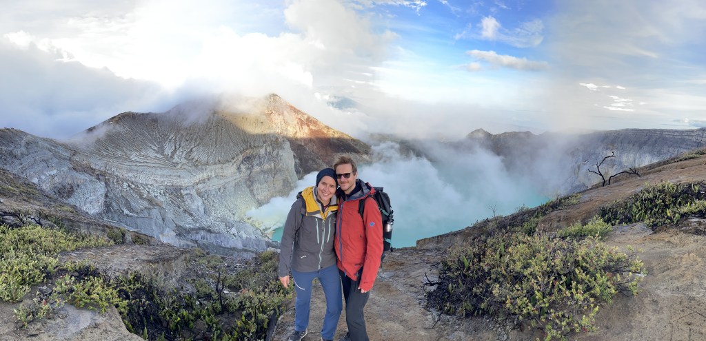 Spektakulärer als dieses, sich doch wirklich fast jeden Tag wiederholende, Ereignis des Sonnenaufgangs, war für uns der Blick in den Vulkankrater mit seinem türkisgrünen See und den Rauchschwaden bei Tageslicht. Dem Beispiel seiner Kollegen am Steinbruch folgend und wahrscheinlich sehr zur Freude vieler anderer Kunden, lotse uns der Guide zuverlässig zu den besten Instagram-Fotopunkten und beeindruckte uns mit seinen Kenntnissen über verschiedene Formattypen und Aufnahmemodi. Er bewies außerdem eine erstaunliche Ausdauer – im Gegensatz zu uns. Nach 6 verschiedenen Punkten und wahrscheinlich über 50 Aufnahmen reichte es vor allem Antonia und sie erklärte das Fotoshooting für beendet. Offensichtlich gehören dieser – aus unserer Sicht – Fotowahnsinn und Kenntnisse über die besten Instagram-Spots heute zum Geschäft des Fremdenführers und machen die Touristen glücklich. Die Beobachtung vieler anwesender Touristen bestätigte diesen Eindruck. Uns würde man dagegen vermutlich in die Kategorie „Dinosaurier-Tourist“ stecken und wie folgt beschreiben: