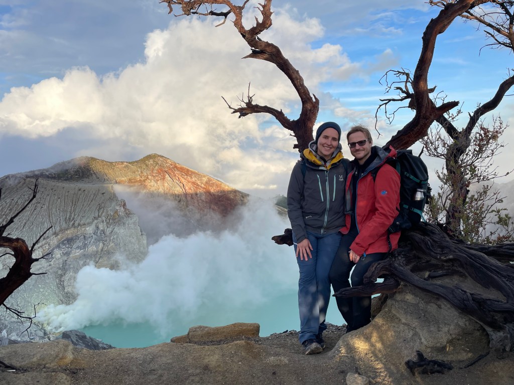 Nach einem kurzen Frühstück kam die lange Fahrt zum nächsten Hotel, Berg und Sonnenaufgang. Diesmal ging es noch früher in der Nacht, um 2 Uhr, zum Ausgangspunkt für den Ijen Krater. Diesmal wurde uns allerdings ein Führer zur Seite gestellt und so ging es um 3 Uhr bei konstantem Nieselregen den Berg hinauf. Wir waren für alle Witterungsverhältnisse gut ausgerüstet und mit unseren Wanderschuhen hatten wir auch auf dem steilen, matschigen Sandweg guten Halt. Damit stellten wir eher die Ausnahme da. Um uns herum waren haufenweise andere Besucher ohne Taschen- oder Stirnlampen, in Jogginghose und Sweatshirt, ohne Regenjacke oder nur mit einem dünnen Ragencape und in Flip-Flops oder Adiletten unterwegs. Weder an das Laufen, noch an die Steigung des Weges gewöhnt und mit mangelnder Ausrüstung sah sich der ein oder andere seinem Endgegner gegenüber. Nach dem Motto „zwei vor, einer zurück“, kämpften sie sich den rutschigen Pfad entlang, eine Hand an den genauso unglücklichen Beimann geklammert. Bald schon zeugten Matsch und Dreck auf der Kleidung der „Wanderer“ von unliebsamen Kontakten mit dem Boden. Die ganze Szene erinnerte uns sehr an die Fernseh-Show Takeshi´s Castle und wir mussten – gemeinerweise – lachen. Um diesem unglücklichen Schicksal zu entgehen, verzichtete manche*r ganz auf das Laufen und ließ sich für umgerechnet etwa 20 Euro von drei Männern in einem zweirädrigen Karren den Berg hinauf ziehen.