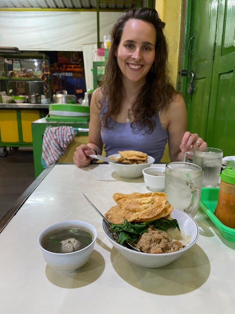 In Yogyakarta entdeckten wir auch sofort die Warungs für uns. Warung ist die Bezeichnung für eine typische indonesische Garküche. Die Ausstattung reicht vom „echten“ Restaurant mit Dach, Tischen und Stühlen, über einfachere Stände mit Sitzgelegenheiten bis zum mobilen Küchenwagen am Straßenrand. Man findet solche Warungs wirklich so gut wie überall und wir tasteten uns zunächst langsam in eben der genannten Reihenfolge heran, hatten bald aber überhaupt keine Vorbehalte mehr. Fast jede Insel in Indonesien hat ihre eigenen Spezialitäten und wir probierten einen Großteil davon in eben diesen Warungs. Bis auf extrem seltene Ausnahmen vermieden wir größere Restaurants und ausländisches Essen. Die indonesische Küche war eine Offenbarung an Geschmack für uns und sobald der Hunger kam, hielten wir nach dem nächsten „kleinen Warüngchen“ (so nannten wir die kleinen Restos bald liebevoll) Ausschau. Uns konnte es gar nicht „einheimisch“ genug sein, auch wenn das manchmal hieß, sich mit Hand und Fuß zu verständigen oder nicht so genau zu wissen, was wir eigentlich bestellt hatten.