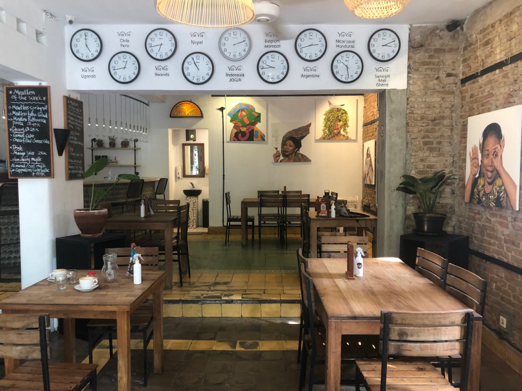 In Yogyakarta angekommen erwartete uns eine sehr positive Überraschung. Unser Hostel war unglaublich gemütlich und authentisch, sauber und ordentlich. Der Empfang war sehr nett und wir fühlten uns gleich wohl. Insbesondere Antonia hatte nach der ersten Erfahrung in Jakarta doch Befürchtungen indonesischen Hostels gegenüber gehegt. Wie wir am nächsten Tag herausfanden, waren wir im Studententeil der Stadt zwischen vielen netten Restaurants, Cafés und kleinen Geschäften gelandet. Es war wunderbar, mal wieder durch eine Stadt zu laufen und sie zu Fuß erkunden zu können.
